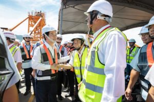 隨後,總統與現場貴賓一同進行合龍啟動儀式,見證鋼梁節塊吊升,淡江大橋全橋閉合。