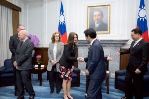 訪賓一行由外交部長林佳龍及美國在台協會台北辦事處代理處長梁凱雯(Karin M. Lang)陪同,前來總統府晉見總統,國家安全會議秘書長吳釗燮也在座。