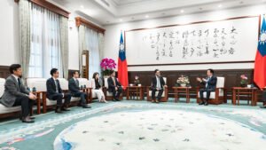 訪賓一行由台灣工具機暨零組件工業同業公會理事長陳紳騰率領,經濟部長龔明鑫陪同,前來總統府晉見總統,總統府秘書長潘孟安也在座。