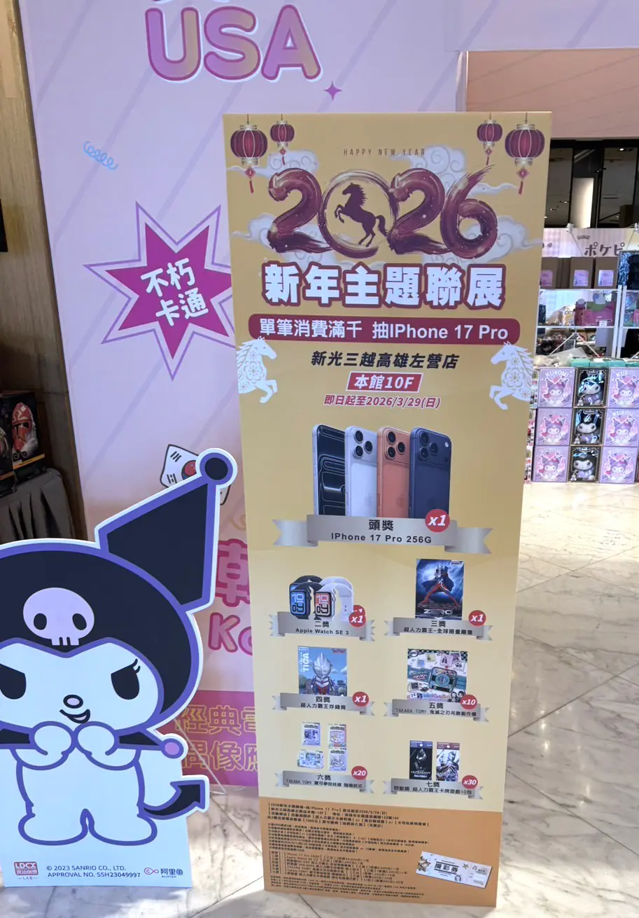 「馬上好康」開運雙重送,《新光三越高雄左營店》10 F美日韓特賣會除了部分特價特賣商品嘉惠消費者外,更祭出單筆消費滿千元,就有機會抽總獎金逾10萬元大獎,春節期間特賣會場吸引大批人潮。迎接228連假,主辦單位指出,熱門商品包括三麗鷗家族、寶可夢、Netflix熱播偶像劇《難哄》、伊藤潤二、《放克牙寶》、藍色監獄、彩虹小馬及《魷魚遊戲》等超人氣IP與話題商品持續熱賣,另有超大獎IPhone 17 Pro 、Apple Watch及超人力霸王全球限量雕像等獎品等著大家前來抽好康。