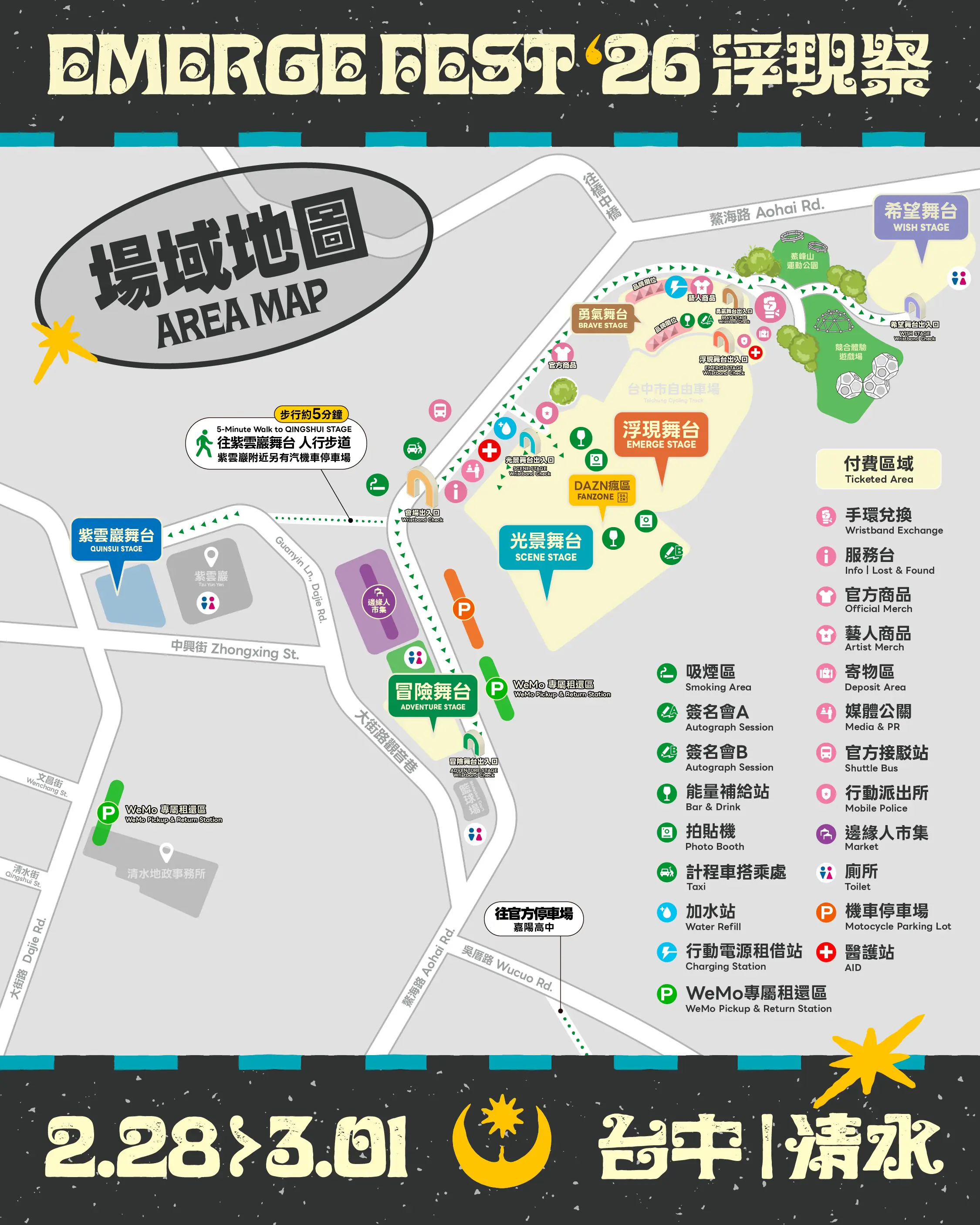 2026年台灣指標性音樂節「浮現祭(EMERGE FEST)」將於2月28日至3月1日在台中清水鰲峰山運動公園盛大登場,預估活動期間將吸引約5萬人次湧入清水地區。台中市政府已完成跨局處整備,包含交通疏導、秩序維護、現場安全與周邊環境整潔等措施,並呼籲樂迷提早規劃行程,善用大眾運輸與相關接駁措施,共同讓進場更順暢、觀賞更安心。