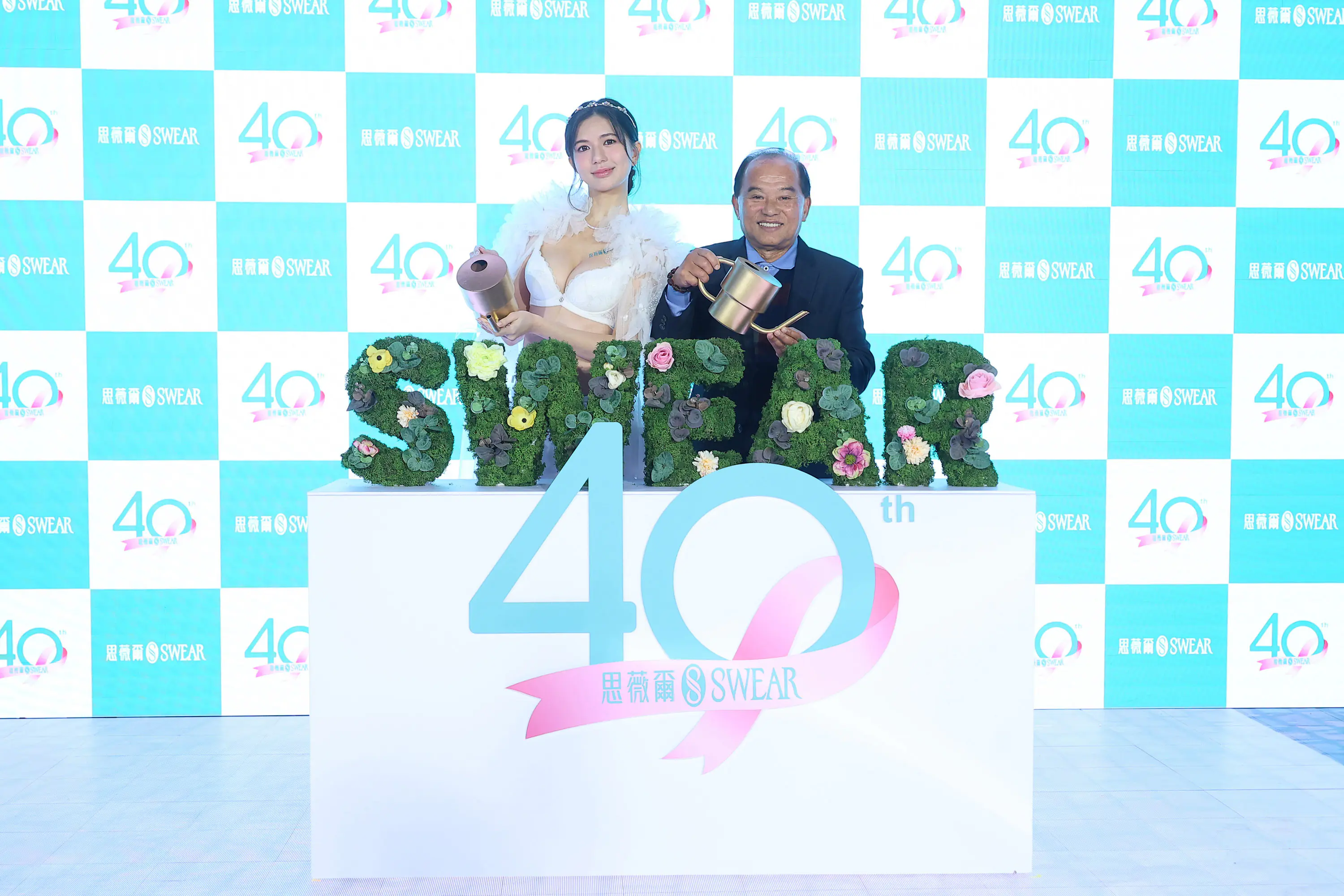 記者會現場除了可看到不同系列商品,代言人鄭芯恩與品牌代表共同澆灌品牌 SWEAR 大字意象植栽,象徵品牌從萌芽、成長到綻放,敘述40年工藝的延續與更迭,也代表著品牌四十年來持續灌溉美麗、細膩工藝與女性自信。
