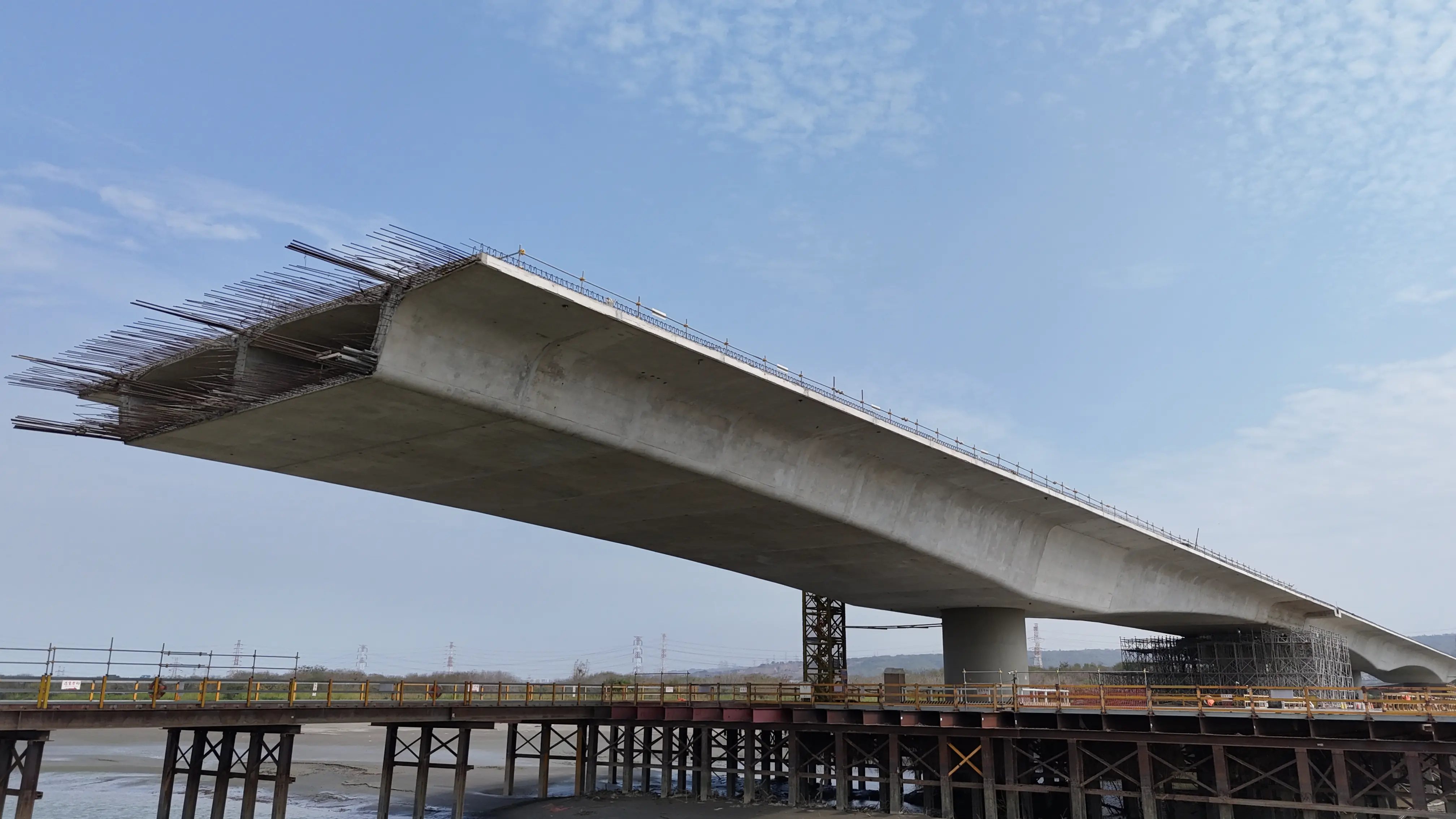 陳局長指出,工程北起大肚區文昌路,南接和美鎮台61乙線,全長約1,440公尺、寬22公尺,規劃雙向4車道及2個機車專用道,並於下游側設置人行與自行車共用道,是中部地區近年規模最大的橋梁新建工程之一。自112年1月開工以來,歷經113年凱米颱風及114年7月底強降雨沖毀施工便橋等考驗,此外,面對臨水域高難度施工條件,施工團隊始終穩健展開深槽區懸臂節塊推進作業,整體進度持續穩定推展。