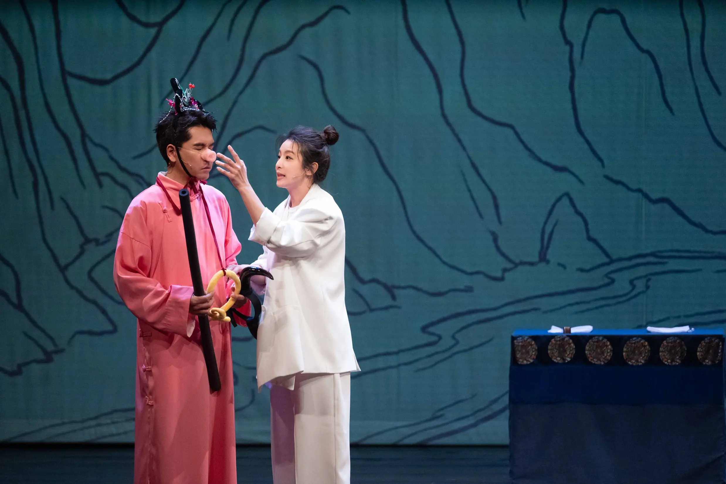 在其中一個精彩段子中,王傳一過足導演癮,以說故事形式重新演繹《西遊記》經典情節。他化身敘事者「考驗」朱德剛與賴雅妍,要求兩人挑戰一人分飾多角,並隨道具迅速變換造型。賴雅妍為了力挺老友,徹底放下女神包袱,戴上豬鼻子與牛角分飾豬八戒與牛魔王;朱德剛則展現「神仙老虎狗」的深厚功力,在孫悟空與鐵扇公主間切換自如。混亂中帶著精湛演技的視覺荒謬感,成為全場笑聲最密集的橋段。許多觀眾看完後紛紛在社群平台分享:「笑到肚子痛,絕無冷場!」、「第一次看相聲脫口秀就獻給了這部作品。」