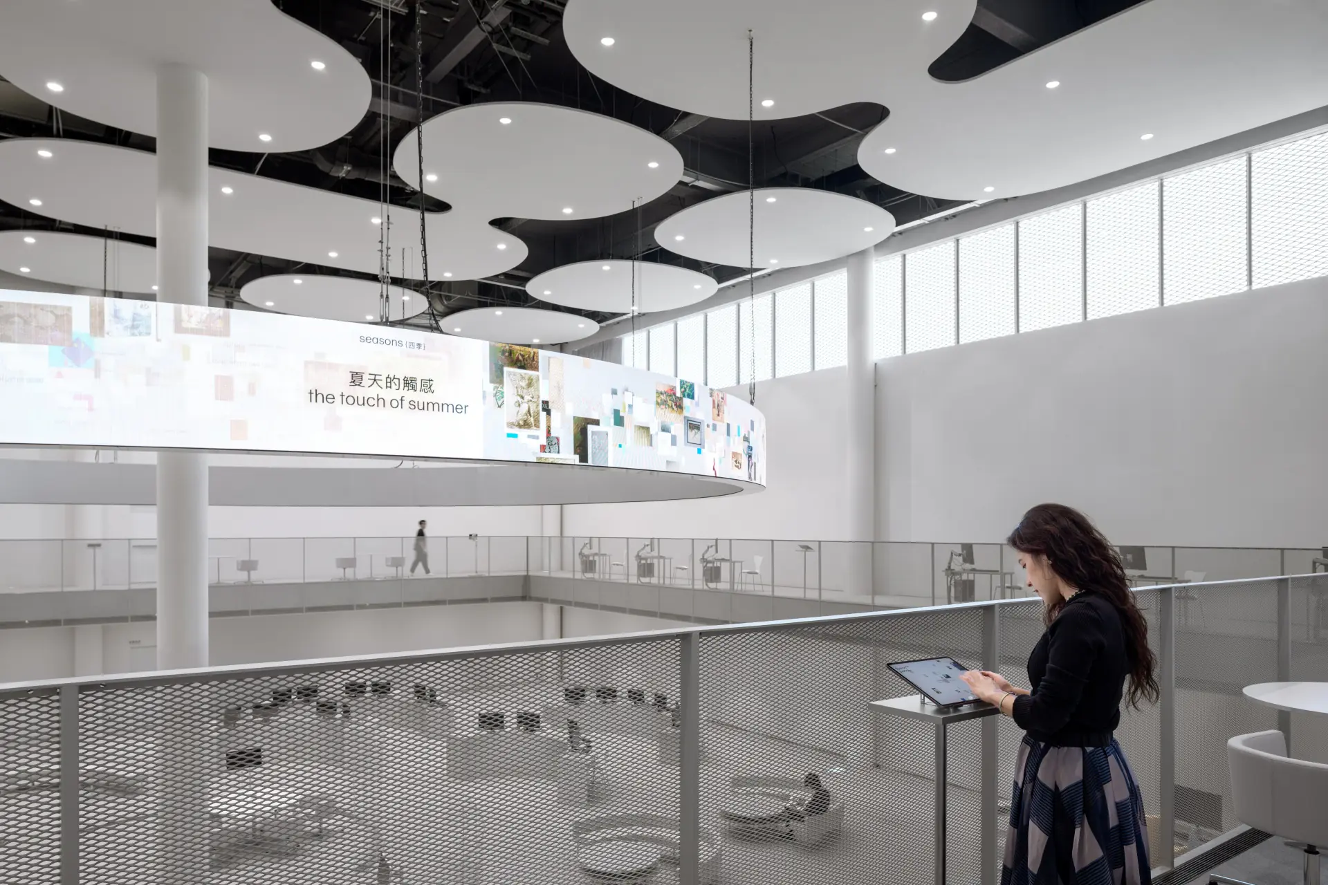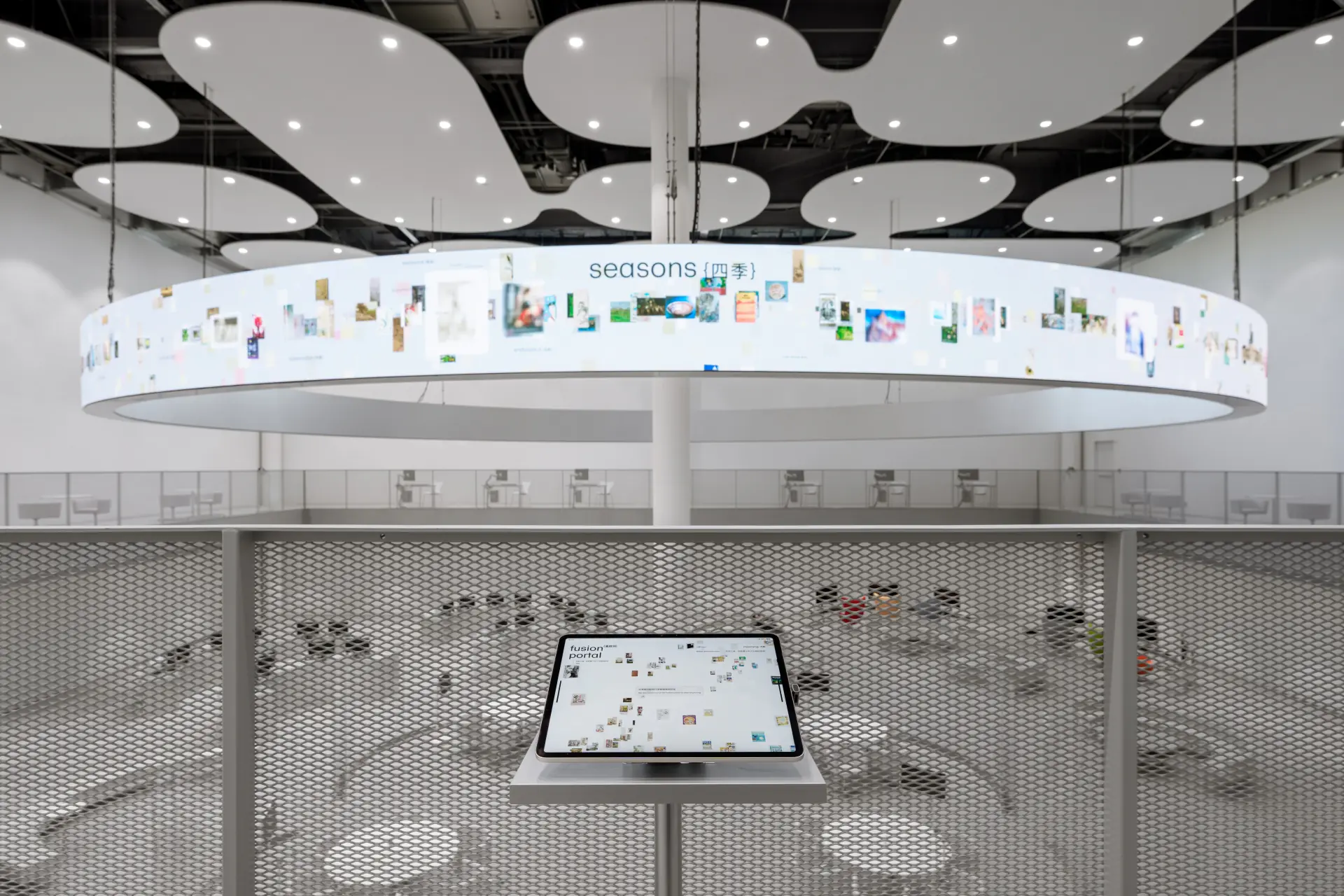 「漫遊洞」的影像內容並非固定播放,而是由AI以圖書館藏資料運算生成。系統以「四季」、「情緒」、「時間」、「水」為主題軸線,將圖書館最新出版的書籍中與美術館藝術品重新建立關聯。例如當畫面出現春天花開的景象時,螢幕內容會延伸介紹描寫自然與季節的文學書籍;當影像轉為流動水紋時,同時又會連結到關於海洋、旅行或哲學思考的書目。不同主題在畫面中交織流動,使知識不再只是靜態分類,而像故事般不斷展開。