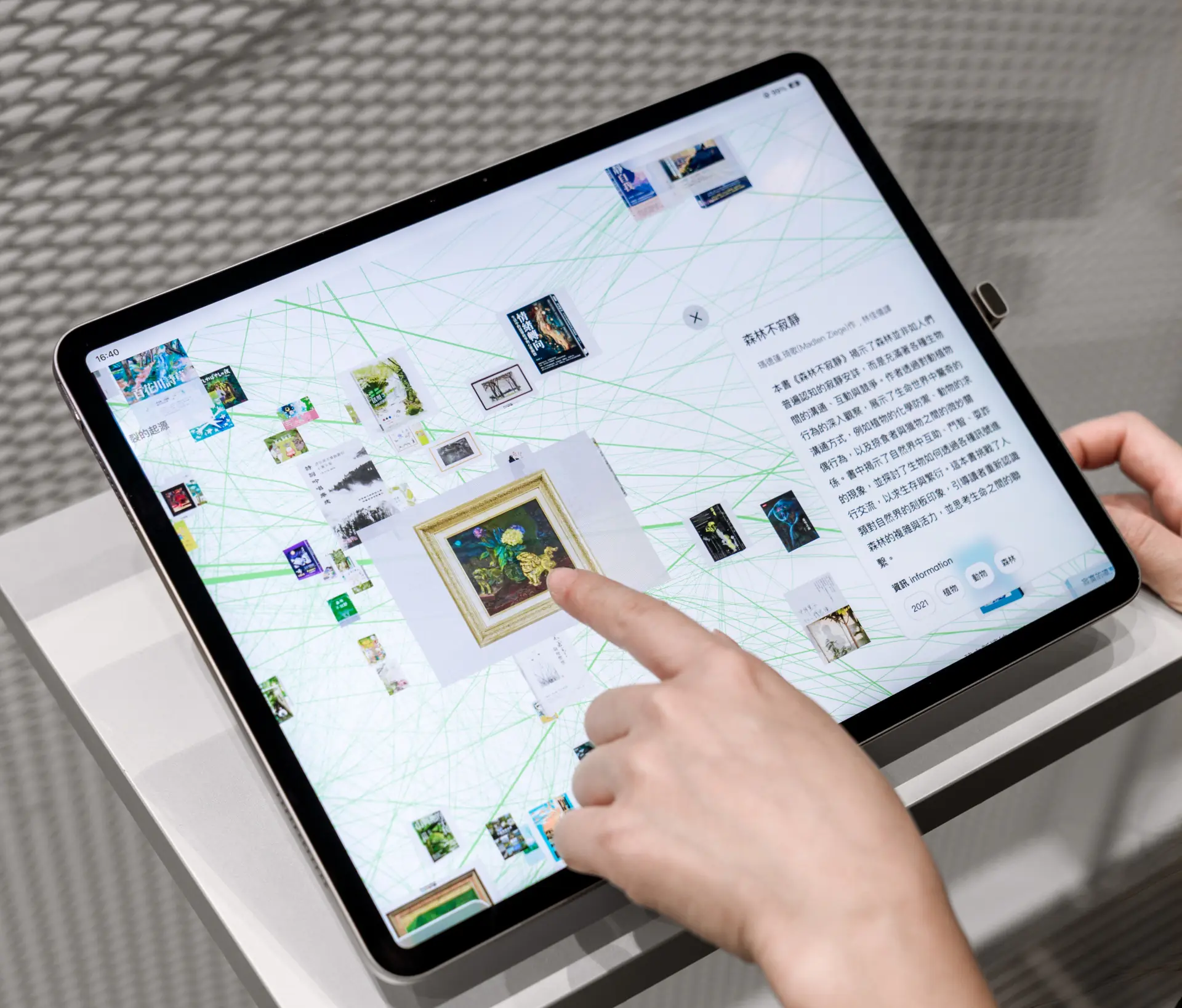 除了抬頭欣賞沉浸式影像,現場也設置4台互動iPad,讓民眾能進一步探索AI建立的知識網絡。只要輕點螢幕,就能在書籍與藝術作品之間跳躍延伸,彷彿在知識地圖裡展開探險。有人從一幅畫出發找到相關小說,也有人從一本書延伸到不同時代的藝術創作,越探索越有趣。