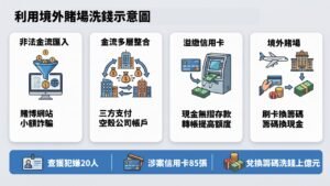 警方表示,刷卡手在賭場完成購碼後,再由賭場內幹部接應收受籌碼或兌換成港幣,藉此形成一條將我國境內不法資金輸往境外的洗錢管道。涉案人除協助移轉資金外,還可藉由海外刷卡消費獲取紅利點數,成為吸引參與者的重要誘因之一。