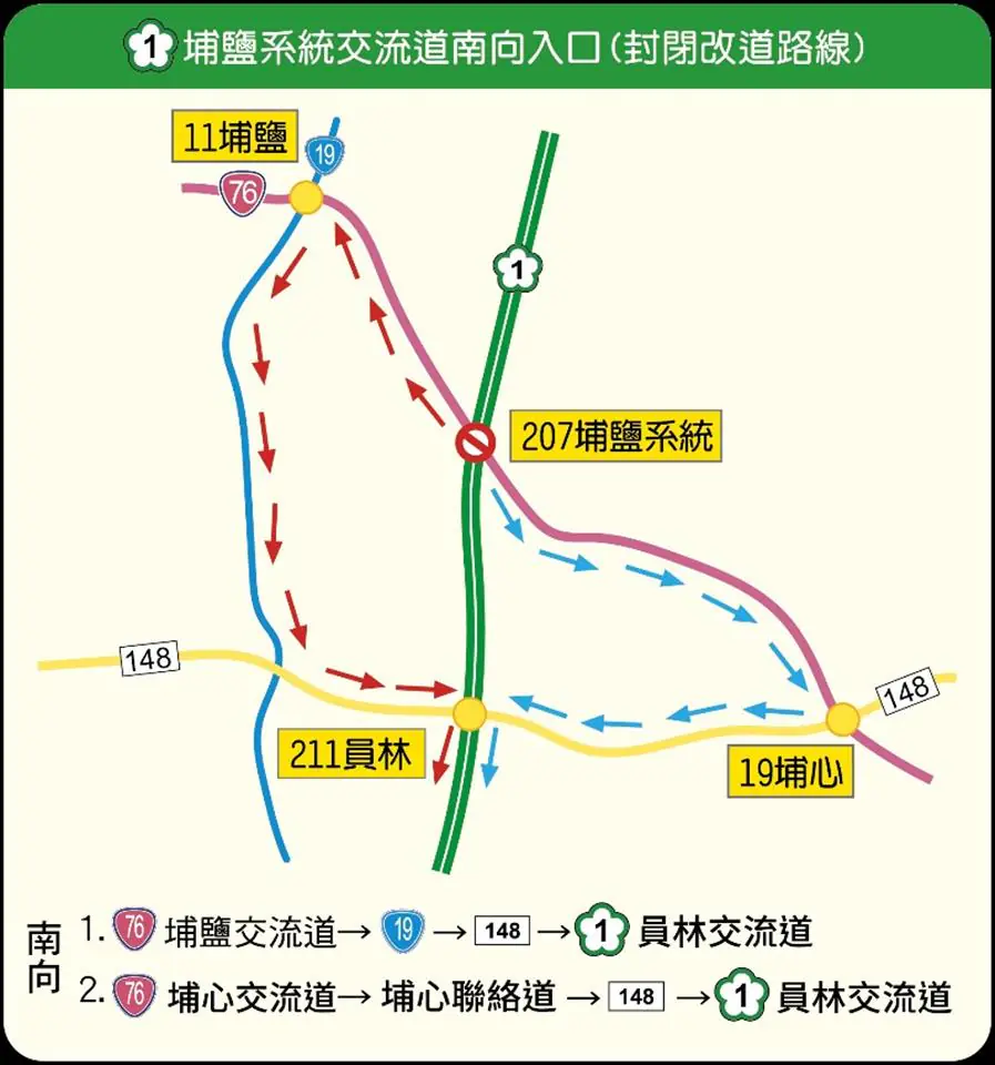 (一) 員林、溪湖地區民眾改道行駛縣148線(員鹿路)、台1線(中山路)、台19線(彰水路)、縣150線(斗苑路),選擇由北斗交流道上國道1號。