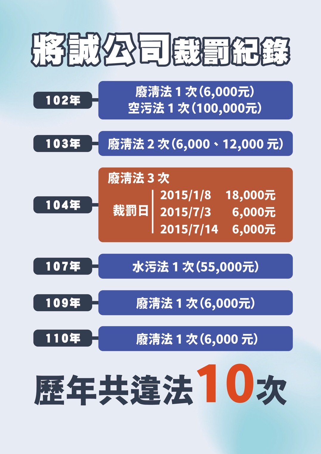 環保局秘書許何誠指出,針對將誠公司違規行為,已依相關法規從重裁罰,包括違反水污染防治法開罰2,000萬元、違反廢棄物清理法開罰174萬6,000元,以及違反空氣污染防制法開罰40萬元,並依法撤銷其廢棄物清除許可證。
