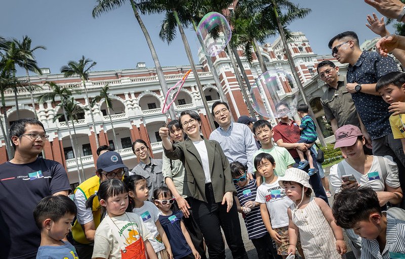 蕭美琴副總統今(11)日上午出席「總統府假日開放參觀活動」,體驗現場各種饒富童趣的遊戲,並參觀臺灣地景漫畫特展,活動中也與在場民眾親切拍照互動。