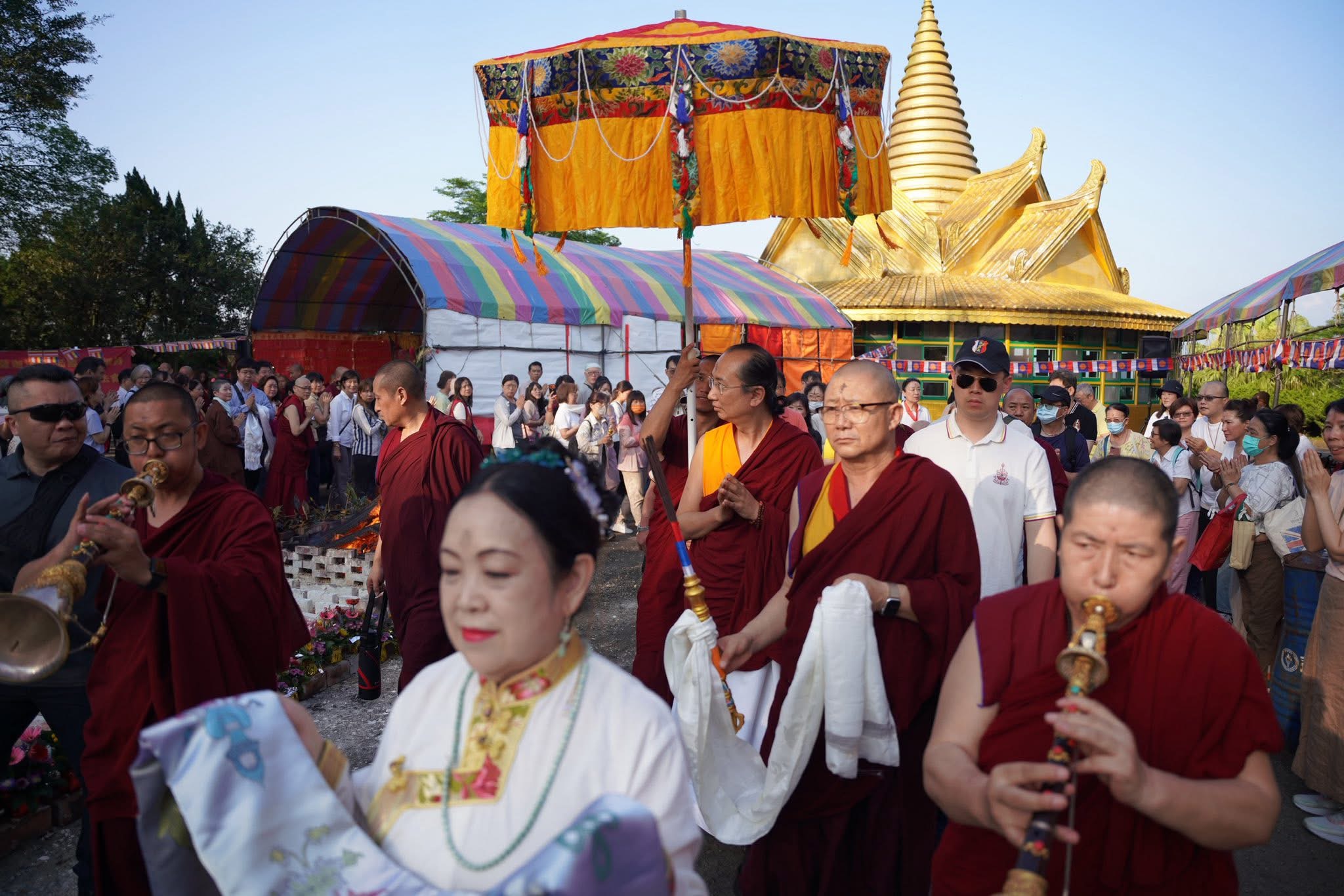 特別是在火供進行之際,烈焰與金色佛塔相映,色彩鮮明而莊嚴,構成極具震撼力的畫面。對許多參與者而言,這不僅是一場法會,也是一場難得的心靈洗禮。火焰燒的是供品,照見的卻是人心;升起的是煙雲,留下的卻是願力與希望。