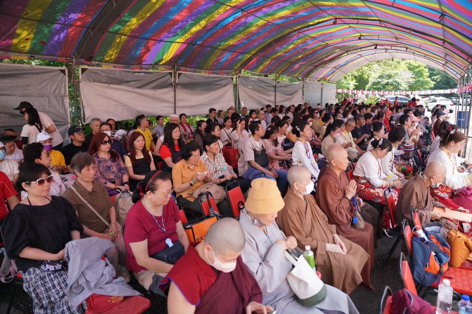 從現場照片可見,法王抵達時受到信眾恭敬迎請,隨後進入壇城主持法會;會場中,不論是僧眾、居士,或遠道而來的信眾,都在同一片法音之中安住身心。有人靜坐默禱,有人隨誦儀軌,也有人只是靜靜望著火焰,但那份專注,本身就是一種修持。