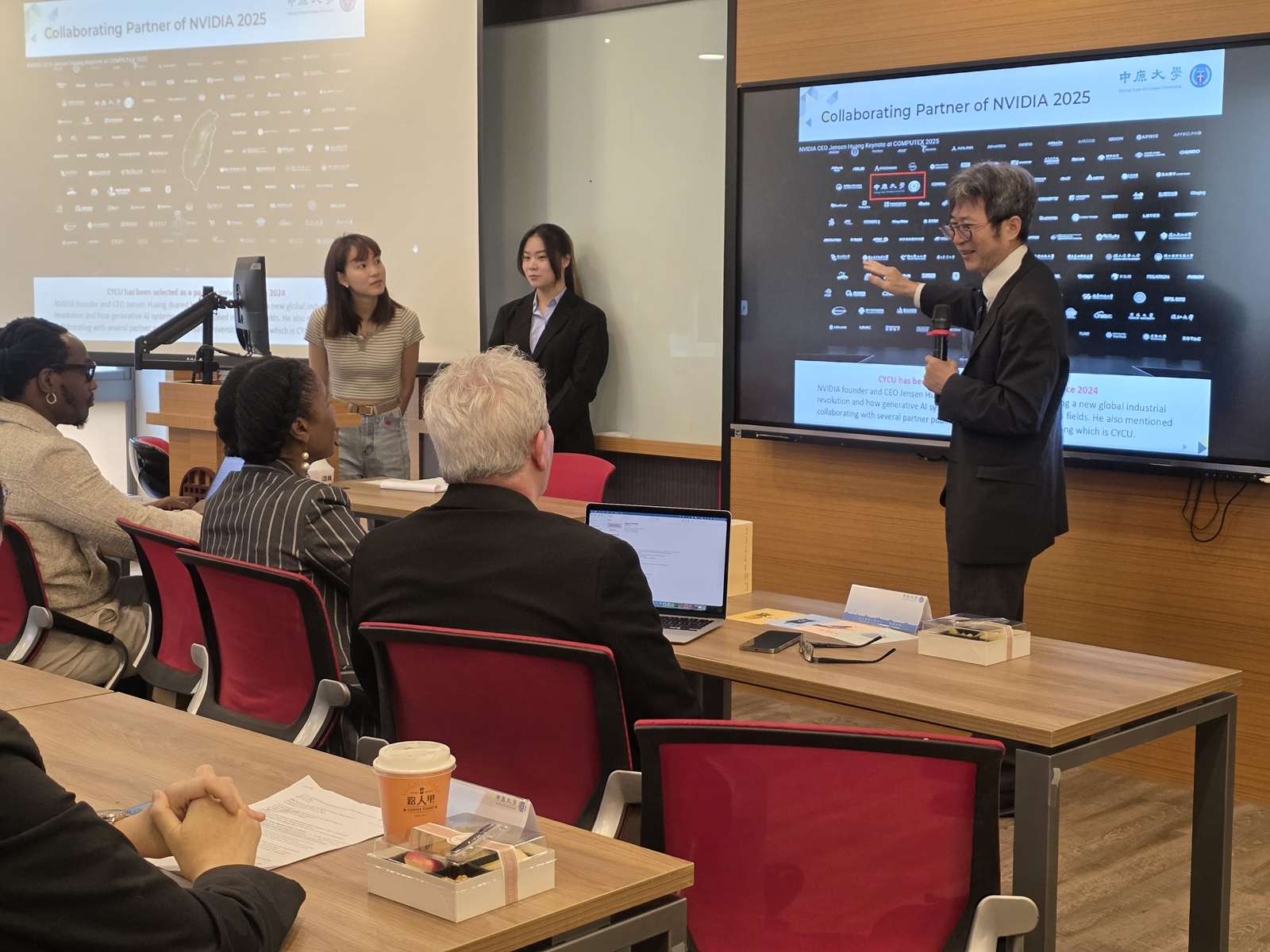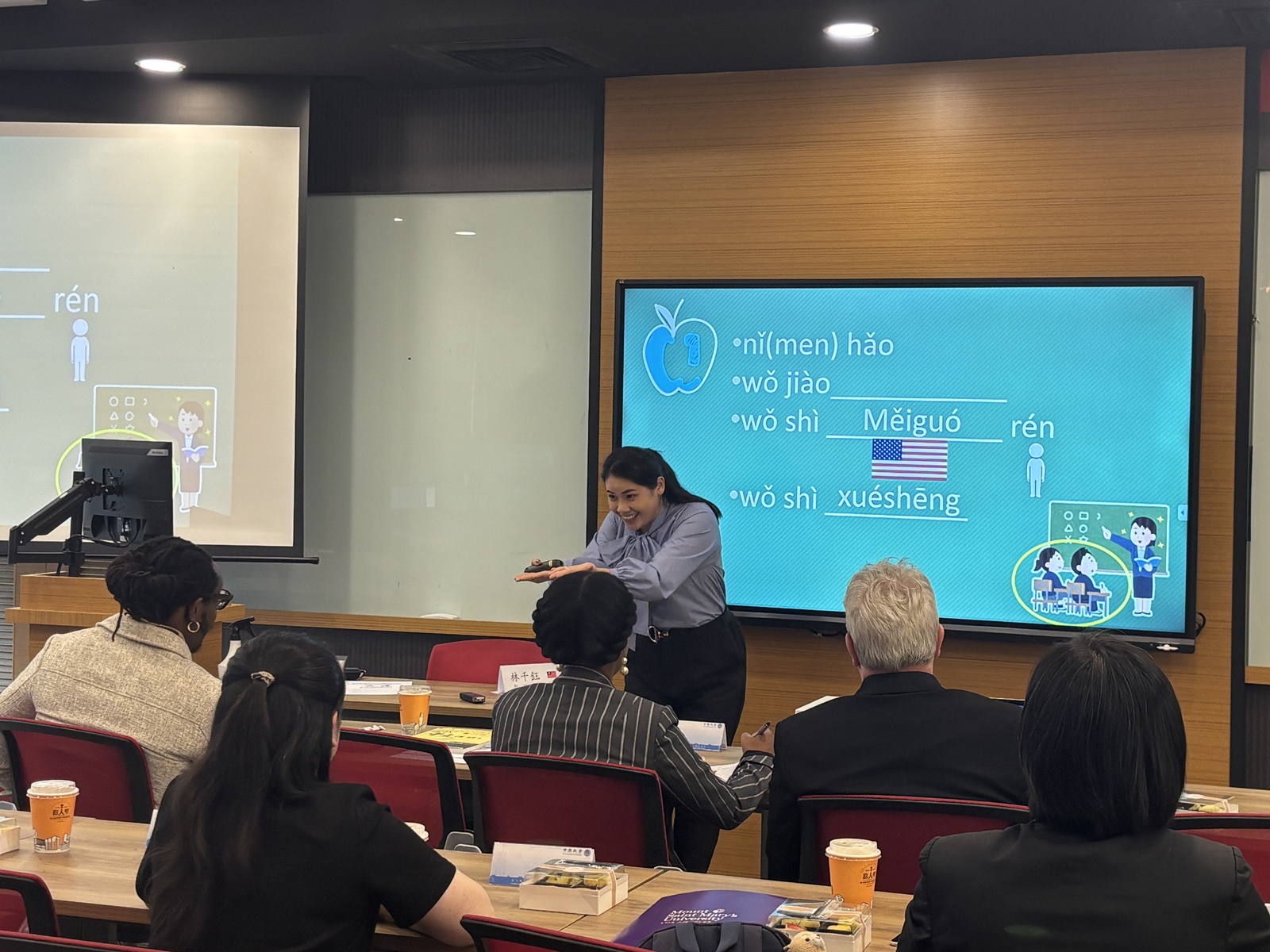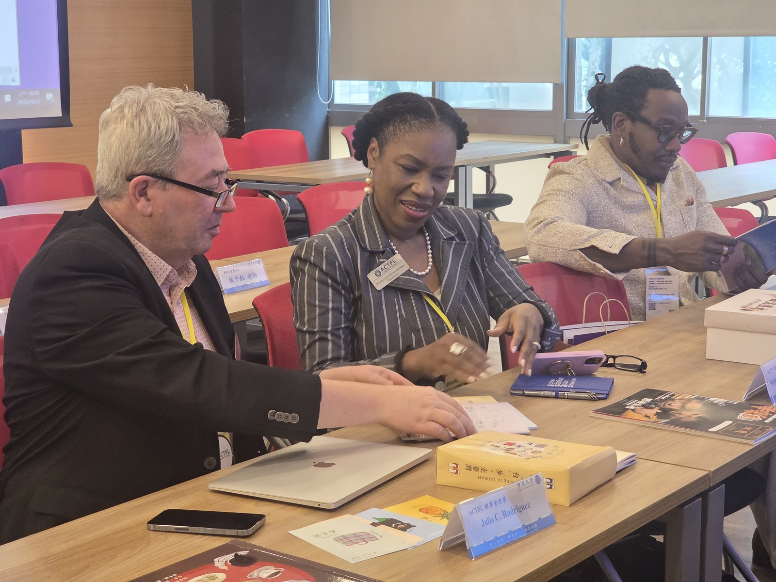 交流過程中,ACTFL理事會主席Krishauna Hines-Gaither博士對「AI輔助教學」表達濃厚興趣,特別關注中原華語文中心自編教材及應華系學生專題作品中AI技術的融合運用,如應華系學生製作的台灣生活華語手冊《用「台」步,走臺灣》即在手繪之外亦運用AI輔助美術設計。資深華語教師林千鈺介紹「翻頁即授課」的線性邏輯教學設計,翻轉主流華語教科書模式,而遵循「視覺、聲音、意義」的順序,強調第一堂課即讓學生開口說,建立學習成就感,並現場教授ACTFL代表團以中文自我介紹,ACTFL理事會理事對此教學法之成效驚豔不已。