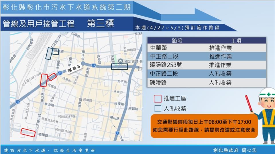 【彰化市污水下水道施工公告4/27(一)~5/3(日)】
