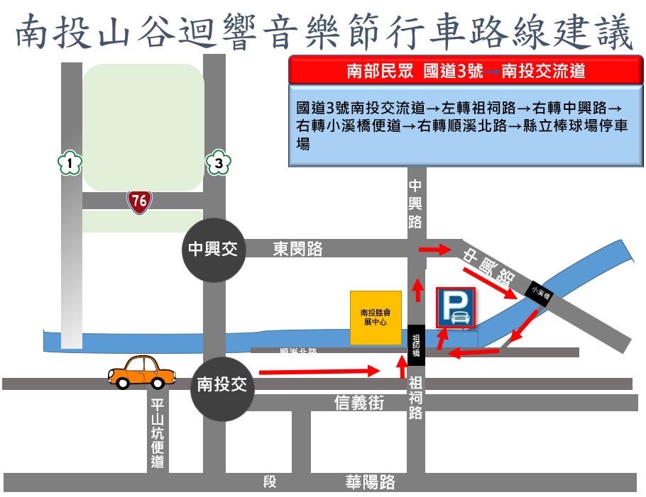 (五)前往音樂節行車主要規劃路線建議如下:1、 北部民眾由國道3號中興交流道→右轉省府路→右轉東閔路→