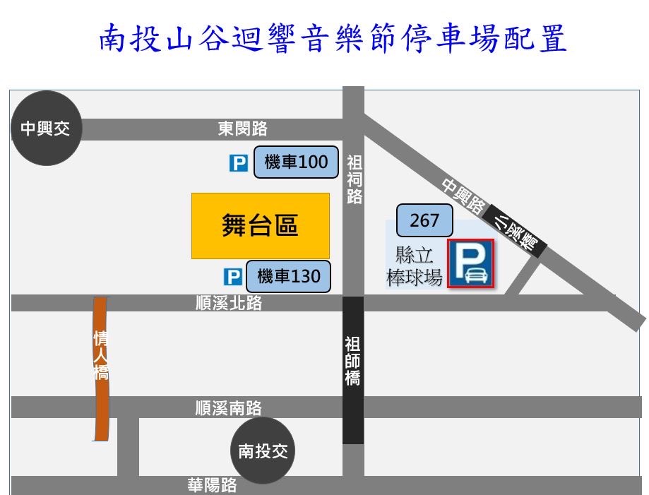 (四)停車規劃:1、 汽車:會場停車格、南投縣立棒球場兩處;