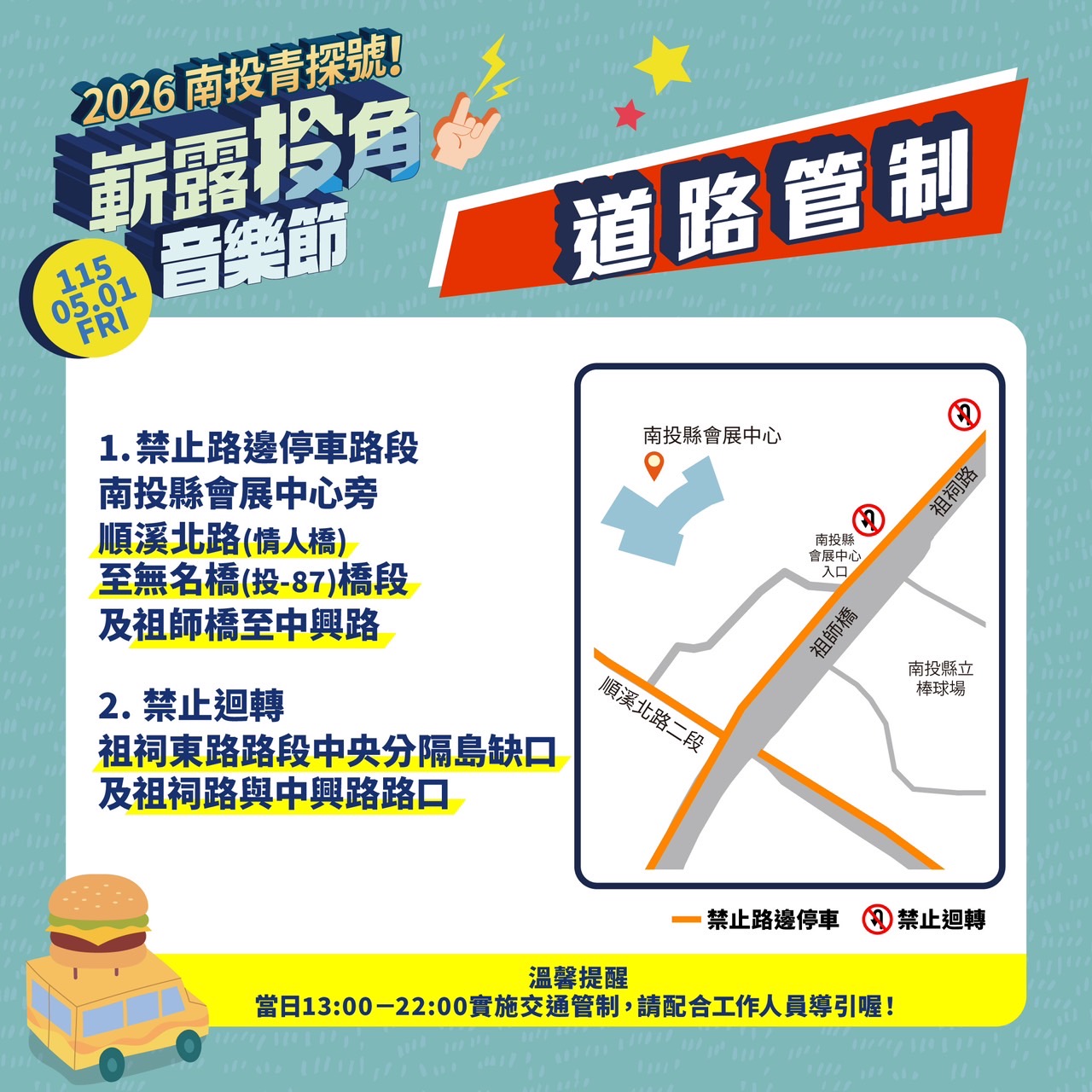 南投音樂盛宴「2026南投青探號!嶄露投角音樂節」5月1日( 五)14時30分至21時30分, 將在南投縣農工商會展中心盛大登場, 南投縣政府為確保活動期間交通順暢與安全, 公告部分路段實施交通管制: