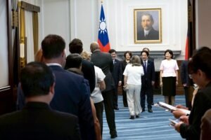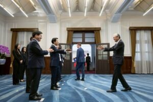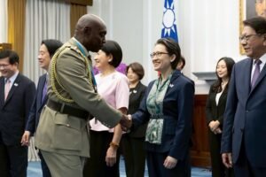 賴清德總統伉儷偕同蕭美琴副總統今(10)日上午在總統府接受參加中華民國114年國慶活動的各國慶賀團、代表們及駐臺使節,致賀我國雙十國慶。