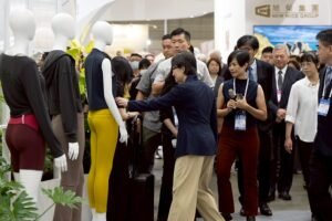 隨後,副總統在紡拓會郭董事長等人陪同下參觀展區攤位,進一步了解臺灣紡織業的發展趨勢。
