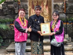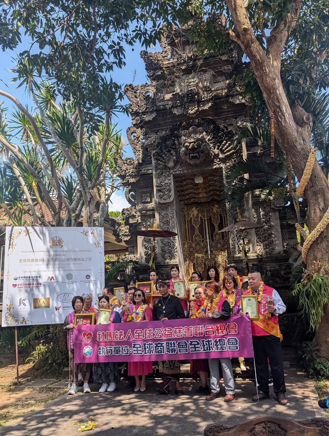 【記者 曹雅婷/峇厘島報導】「全球商聯會全球總會」印尼皇宮國際公益慈善之旅一行23名百工百業代表今(18)日上午由總督導易淑寬帶領在當地警方護送下前往峇厘島皇宮,國王Cok Ibah與王室妻子Jero Asri Kerthyasa親自接見並致贈獎牌。代表「台灣之光」獲此尊貴殊榮,易淑寬也當場將2024年AI醫療照護系統結合紡織品的AI黑科技衣敬贈給國王伉儷表示感謝。
