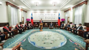 訪賓一行由教育部次長劉國偉陪同,前來總統府晉見總統,總統府秘書長潘孟安也在座。