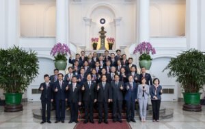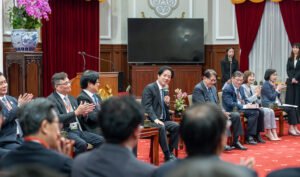 訪賓一行由衛生福利部次長莊人祥陪同,前來總統府晉見總統,總統府秘書長潘孟安也在座。