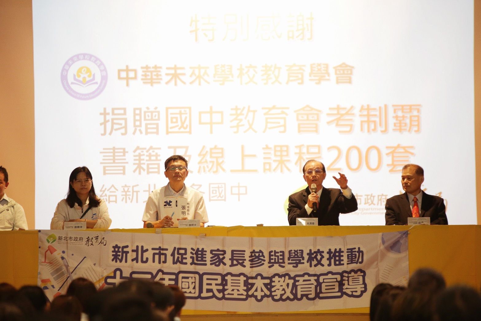 在108課綱推動下,新北與民間合作模式也成為教育界關注焦點。張明文特別感謝中華未來學校教育學會長期並肩投入素養導向課程,包含國(高)中素養導向體驗競賽、新北技高 Challenge 素養競賽、SEL情緒教育融入高中文言文教學與教育GPS計畫課程等。會中,學會與台灣知識庫CSR活動捐贈「國中會考制霸」線上課程與書籍200套共計價值約千萬元,由教育局代表受贈,盼幫助學生強化課綱素養題型解題能力、提升學習競爭力。